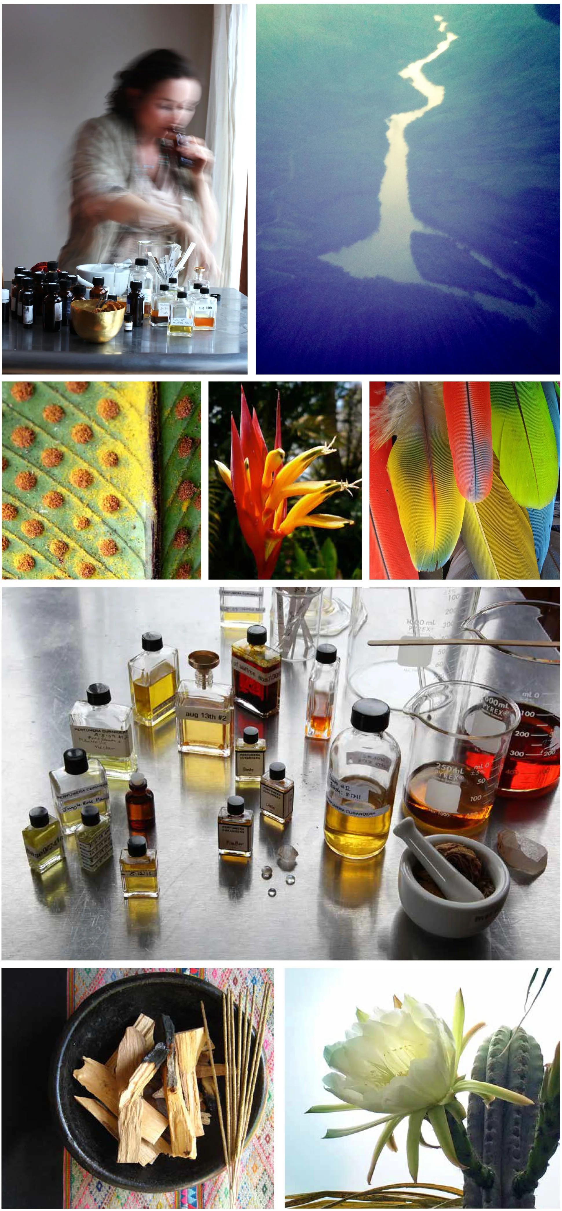 Precious materials such as fragrant Amazonian roots, exotic florals, cacao beans and guyusa from the Peruvian jungles, wild Andean mint and coca leaves and Palo Santo from the Andes, as well as, sage, pinon and juniper berries from the deserts of the southwest, fragrant plumeria and tuberose flowers from the volcanic shores of the Hawaiian Islands all wend their way into her alchemical, handmade perfumes.
